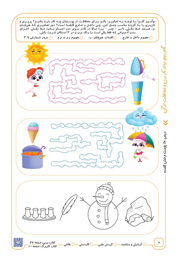 کادر اول (ماز محافظت از پوست): از کودکان بخواهید به تصویر بالایی کتاب کودک، با دقت نگاه کنند و ضمن اشاره به یکی دیگر از نعمت‌های خدا یعنی پوست و حس لامسه و لزوم تشکر از خدای مهربان، از کودکان بپرسید: اگر خدا نعمت حس لامسه را به ما نمی‌داد چه سختی‌هایی برای ما پیش می‌آمد؟ همچنین در مورد راه‌های حفاظت از پوست با کودکان بحث و گفت‌وگو کنید. یادآوری کنید که نوآموزان صحبت‌های خود را با نام خدا شروع و نظر خود را بیان کنند. سپس بگویید: «پرپری در یک روز آفتابی به بازی رفته است. برای محافظت از پوستش چه‌کار باید کند؟ پرپری را به گزینه مناسب برسانید» (کرم ضد آفتاب).
