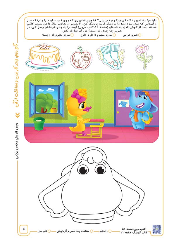 مرور مفاهیم داخل، خارج، باز و بسته (درس 10 و 8): با توجه به داستان، از کودکان بپرسید درختها در کجا هستند؟ (خارج از کلاس). سپس از آنها بخواهید دور درهای باز داخل تصویر خط باز بکشند.