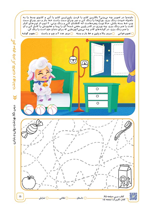 مرور مفهوم چپ و راست و خط باز و بسته (درس 14 و 12): از آنان بپرسید: کمد در کدام سمت تصویر است؟ توپ ها در کدام سمت تصویر هستند؟ سپس بخواهید دور چراغ خوابی که سمت راست است خط باز و دور چراغ خوابی که سمت چپ است خط بسته بکشند و هر دو چراغ را رنگ بزنند.
