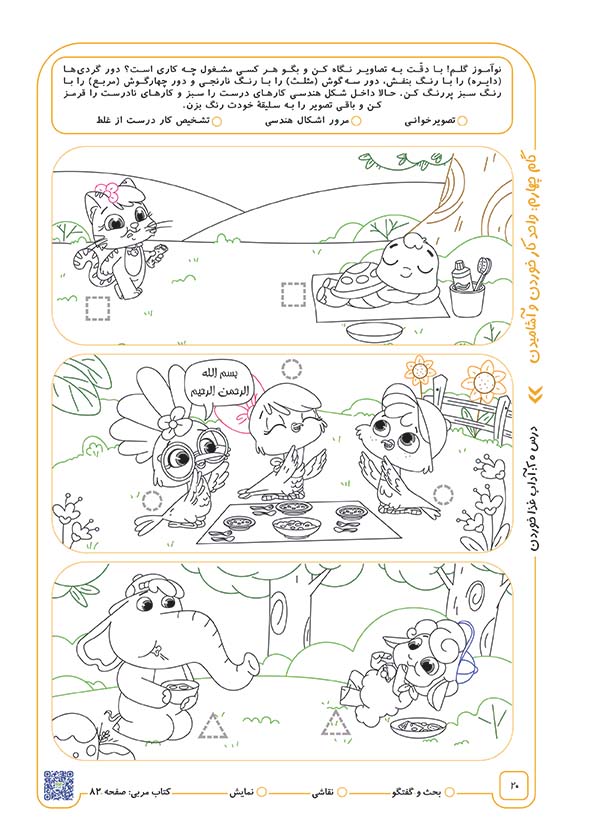 آداب قبل از غذا خوردن: از کودکان بپرسید قبل از شروع غذا چه کارهایی را باید و چه کارهایی را نباید انجام داد؟ بعد از شنیدن نظرات آن‌ها و بیان آداب قبل از غذا ازجمله فوت نکردن به غذا و گفتن «بسم الله الرحمن الرحیم» قبل از غذا خوردن و شستن دست‌ها، از آن‌ها بپرسید که کدام‌یک از این موارد در تصویر آمده است؛ شکل‌های کنار تصویرِ کارِ درست را سبز و کارِ اشتباه را قرمز رنگ کنید (تصویر فیلو و پوپک).