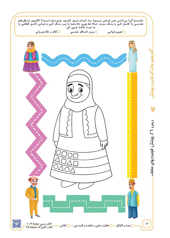 از کودکان بپرسید: شما دوست دارید کدامیک از لباسهای محلی اقوام ایرانی را بپوشید؟ سپس یک عکس از کودک که فقط سر و صورت کودک را در بر داشته باشد روی کاغذ چسبانده و از ایشان بخواهید برای خودش یک لباس محلی نقاشی کند. میتوانید بهجز 4 موردی که در تصویر کتاب آمده است، لباس زیبای سایر اقوام ایرانی را نیز نشان دهید و آنها را نقاشی کنید.