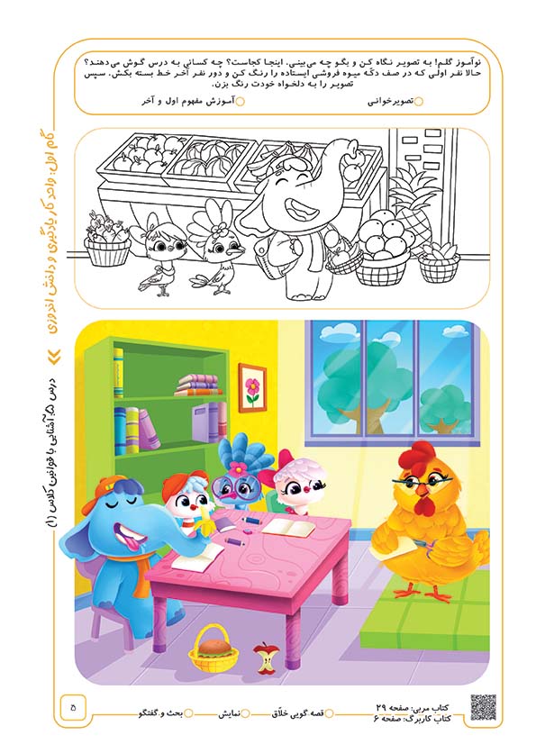 آموزش مفهوم اول و آخر: کودکان را مانند یک قطار، در یک صف قرار دهید و با گفتن «هوهو، چی، چی» پشت سر هم قطار بازی کنند. در حین بازی مفهوم اول و آخر را به کودکان آموزش دهید (چه کسی اول صف ایستاده و چه کسی آخر؟). سپس از کودکان بخواهید با توجه به تصویر بالای صفحه نفر اولی که در صف ایستاده را رنگ کنند و دور نفر آخر خط بکشند. سپس کودکان می توانند به دلخواه دکه میوه فروشی را رنگ آمیزی کنند.