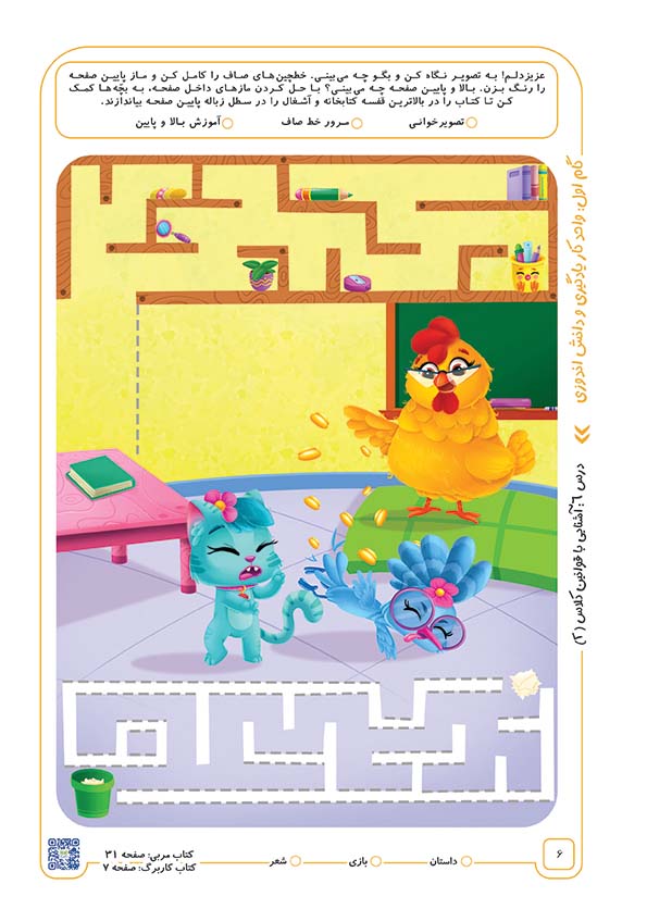 سپس از کودکان بپرسید: در کادر بالا چه چیزی می بینند؟ در کادرپایین چه چیزی است؟ به کودکان بگویید که کلاس باید همیشه تمیز و مرتب باشد و هر کسی وسیلهای که برداشته را سر جایش بگذارد. و نظم و صف گرفتن را رعایت کنند. سپس از کودکان بخواهید با حل کردن مازها به بچه ها کمک کنند تا کتاب را در بالاترین طبقه کتابخانه و آشغال را در سطل زباله پایین صفحه قرار دهند.