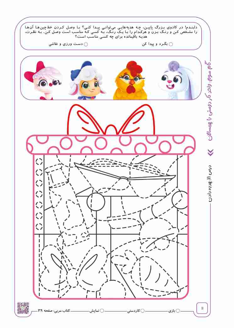 پیدا کردن اشیای مخفی شده: از کودکان بخواهید داخل کادوی پایین صفحه بگردند و برای هریک از افرادی که بالای صفحه تصویرشان آمده، یک هدیه پیدا کنند. سپس، خطچین آنها را پررنگ نموده، آنها را رنگآمیزی کنند و هر کدام را با یک رنگ، به صاحبش وصل کنند.
