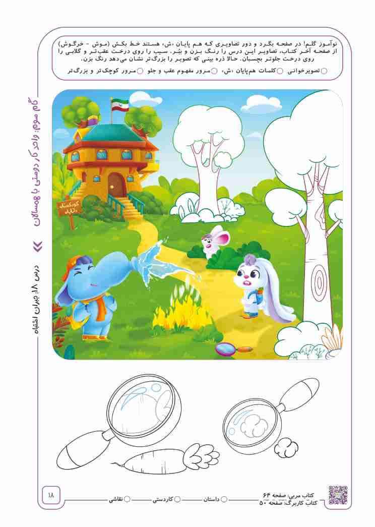 مرور مفهوم «کوچکتر و بزرگتر» (درس 9): توجه نوآموزان را به کادر پایین صفحه جلب نمایید. از آنها بخواهید ذرهبینی که شکل را بزرگتر نشان میدهد رنگ بزنند.