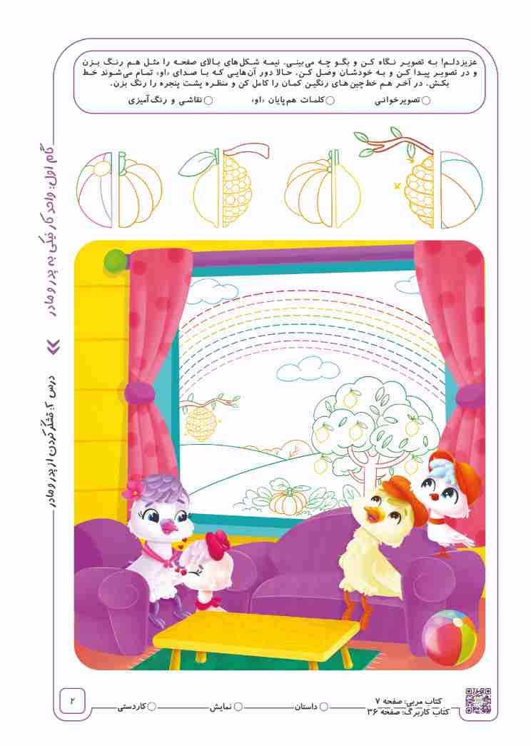 سپس، از آنان بخواهید در کادر بالا نام هر شکل را بگویند و بیان کنند که آخر هرکدام چه صدایی دارد. بعد دونیمه شکل را مشابه هم رنگ کنند و آن شکل را در کادر پایین پیدا کنند و به آن وصل نمایند. در آخر دور شکلهایی که با صدای «او» تمام میشوند، خط بکشند.