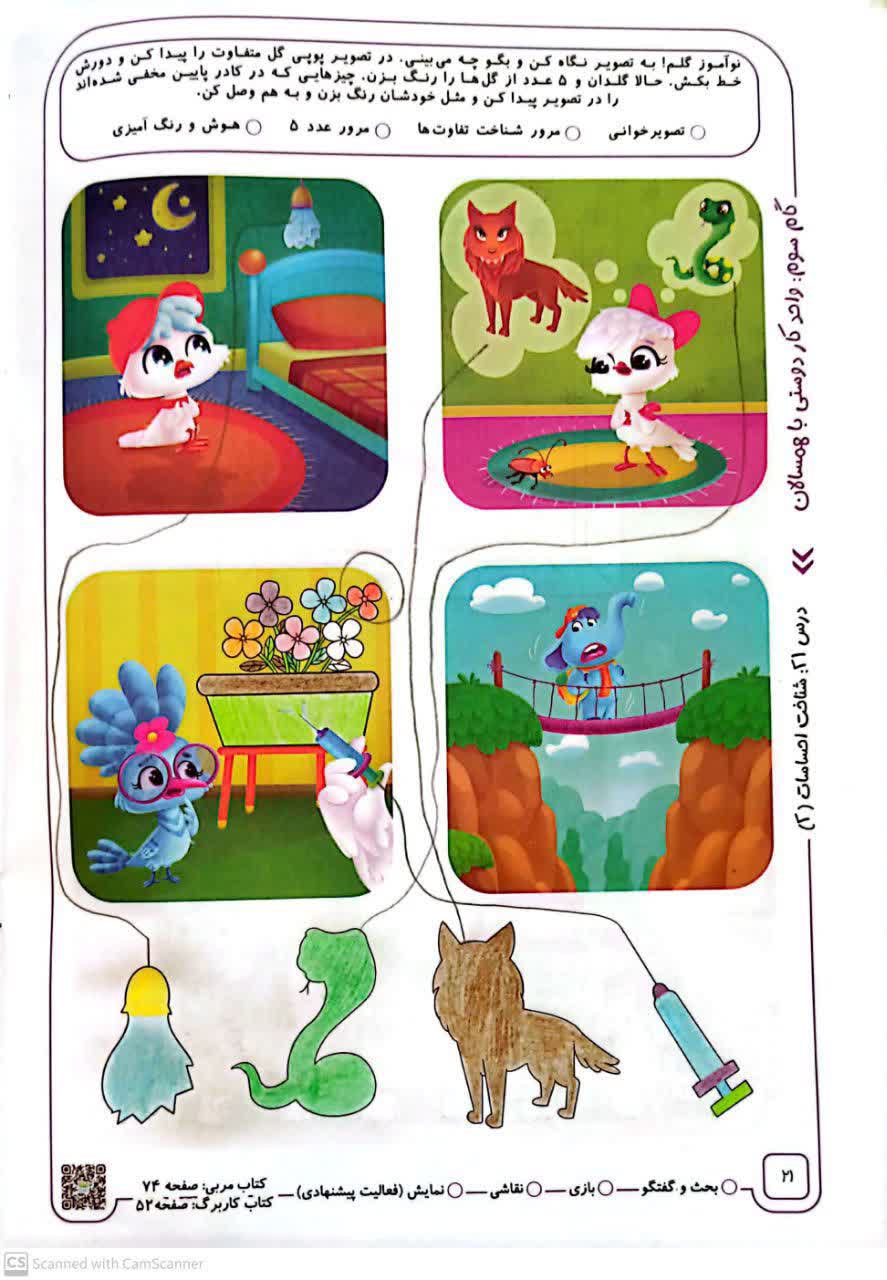 هوش و دستورزی: از نوآموزان بخواهید به پایین صفحه دقت کنند و هالههایی که پایین صفحه آمده را در صفحه پیدا کنند و مثل خودشان رنگآمیزی کرده و هر شکل را به خودش وصل کنند. (آمپول، گرگ، لامپ شکسته، مار)