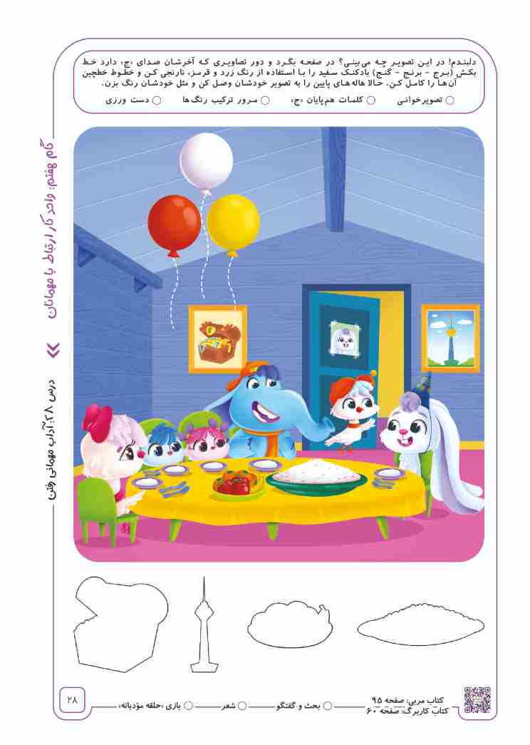 دستورزی: از نوآموزان بخواهید تا خطوط خطچین نخ بادکنکها را پررنگ کنند. حالا به تصویر هالههایی که پایین کتاب آمده دقت کنند و بگویند؛ کدام هاله برای کدام شکل داخل صفحه است. آن را مثل خودش نقاشی کنند.