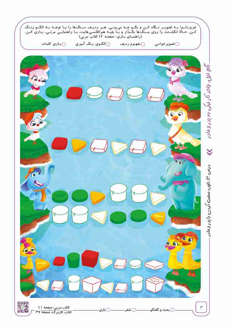 در هر ردیف، پس از رنگ کردن سنگها طبق الگوی داده شده، کودکان انگشت خود را روی سنگها قرار دهند و بهترتیب به هر رنگ سنگی که رسیدند، از این کلمات استفاده کنند.