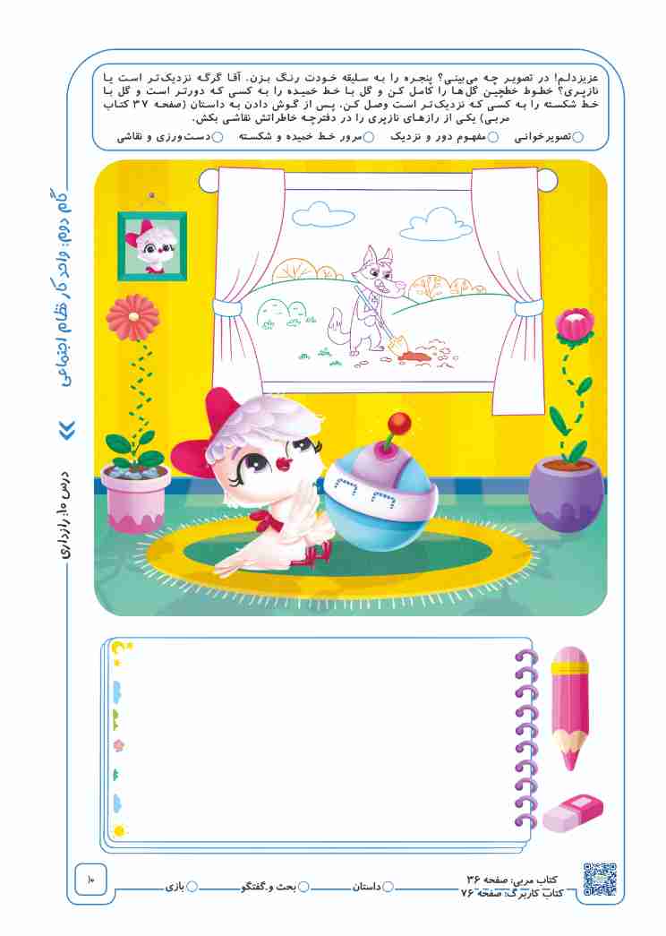آموزش مفهوم دور و نزدیک (درس 7) و مرور خط خمیده و شکسته (درس 7): ابتدا مفهوم دور و نزدیک را بهصورت عینی و بهصورت بازی با استفاده از خود کودکان به آنها آموزش دهید سپس از نوآموزان بپرسید: گرگ نزدیکتر است یا نازپری؟