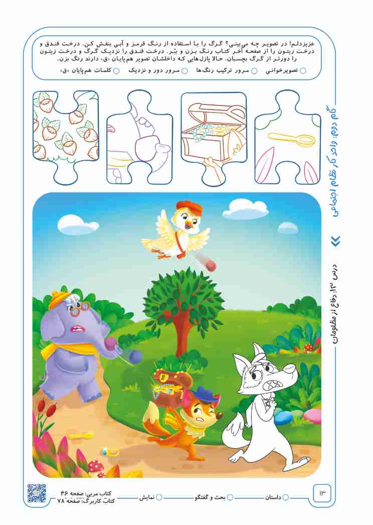 - مرور مفهوم نزدیک و دور (درس 10): از نوآموزان بخواهید به انتهای کتاب بروند و تصویر درخت زیتون و فندق را رنگ زده و ببرند. سپس، درخت فندق را نزدیک گرگ و درخت زیتون را دورتر از گرگ بچسبانند.