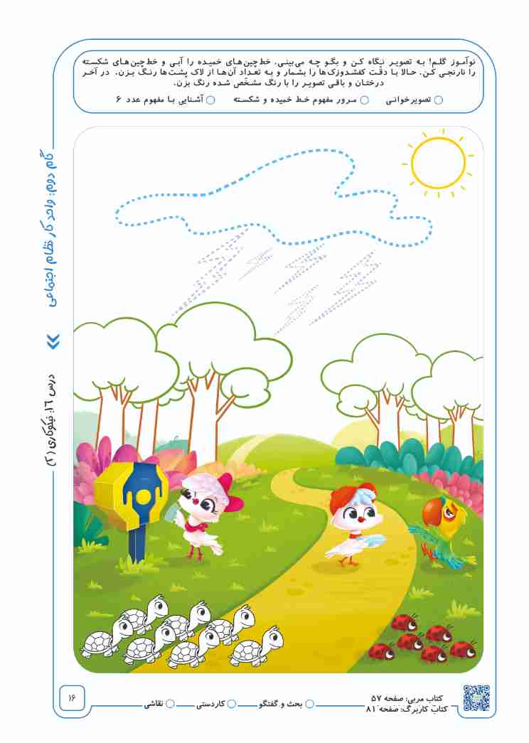 دستورزی و مرور خط خمیده و شکسته: از نوآموزان بخواهید تا خطوط خطچین خمیده و شکسته را در تصویر تشخیص دهند. سپس خطوط خمیده را با رنگ آبی و خطوط شکسته را با رنگ نارنجی پررنگ نمایند.