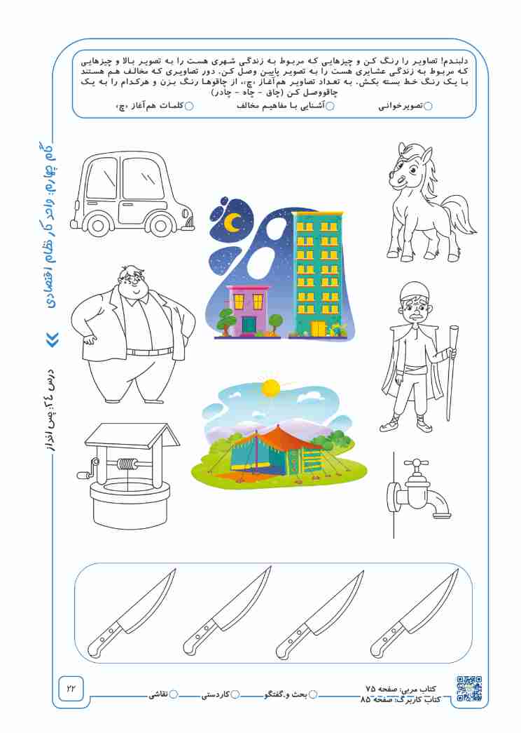 سپس کلماتی را که با صدای «چ» شروع می‌شود، بیان کنید (چابک، چاله، چای). از آن‌ها بپرسید: «چه کلمات دیگری می‌شناسید که صدای اول آن‌ها چ باشد؟» (چاقو، چای، چادر، چاه، چانه، چاله و چاپ). دوباره توجه آنان را به تصویر کادر پایین کتاب جلب نمایید. از کودکان بخواهید نام تصاویر دور دور صفحه را بلند بگویند و به تعداد تصاویری که هم‌آغاز «چ» هستند، از چاقوهای پایین صفحه رنگ کنند و هرکدام از شکل‌های هم آغاز «چ» را به یک چاقو وصل نمایند.