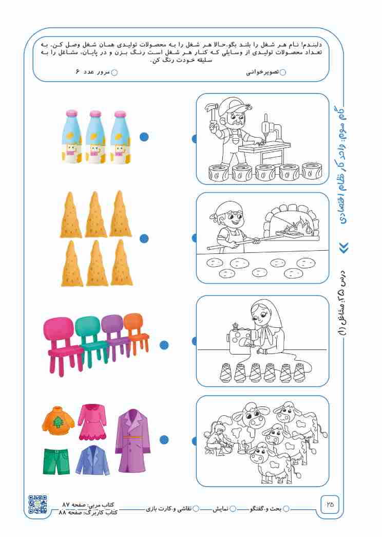 آنگاه توجه کودکان را به ستون سمت چپ جلب نمایید و به آنها بگویید تا در هر شغل، به تعداد محصولات تولیدشده، از اشیای کنار آن شغل رنگ کنند.