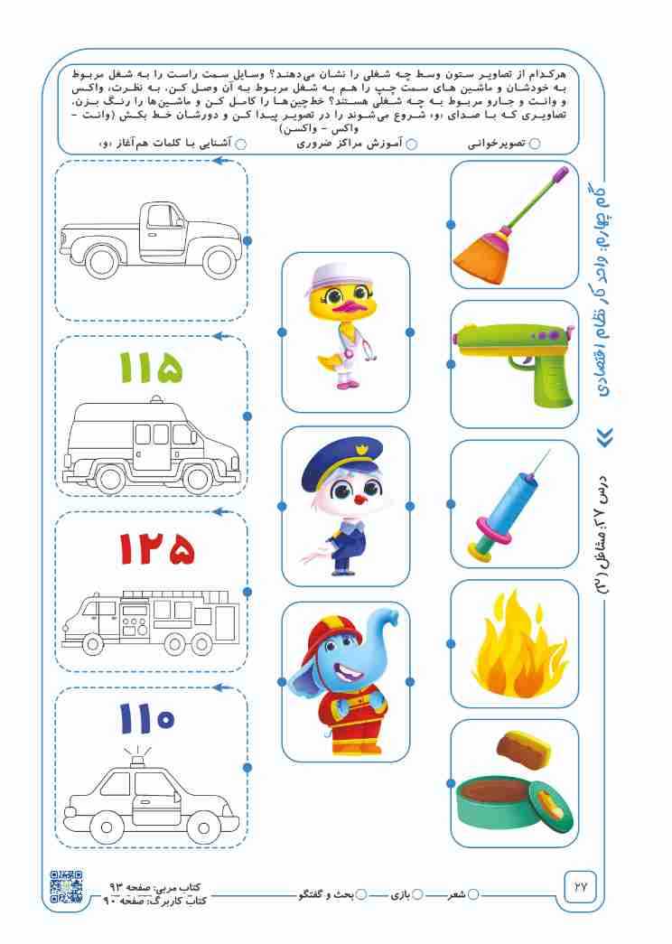 آموزش مراکز ضروری: درخصوص شمارههای ضروری، با کودکان صحبت کنید؛ شمارههایی که در مواقع خطر باید به یاد داشته باشیم (شمارهی آتشنشانی: 125، شمارهی پلیس: 110 و شمارهی فوریتهای پزشکی: 115). سپس از کودکان بخواهید به خودروها و شمارههای بالای تصویر نگاه کنند و با توجه به ماشینهای ستون وسط، هرکدام از شخصیتهای سمت چپ تصویر را به ماشین شغل مورد نظرش وصل نمایند.