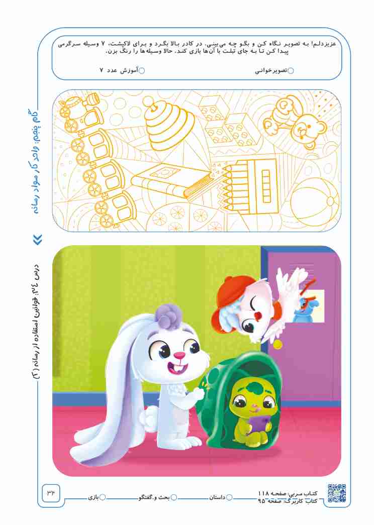 آشنایی با مفهوم عدد 7: ابتدا عدد 7 را بهصورت عینی با کودکان تمرین کنید و از آنها بخواهید هفت نمونه از چیزهایی را که اطراف آنها است، بشمارند و با انگشتان خود، عدد هفت را نشان دهند. سپس با اشاره به کادر بالای صفحه، 7 وسیلهی سرگرمی را که میتوان جایگزین موبایل یا تب لت کرد، پیدا و رنگ کنند.