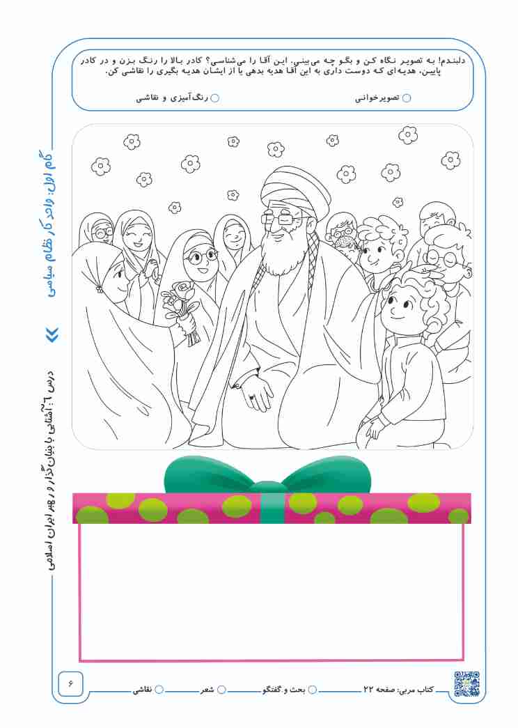 از نوآموزان بپرسید اگر بخواهند یک نقاشی زیبا به رهبر خود هدیه بدهند، چه نقاشیای را برای ایشان میکشند؟ در دفتر نقاشی خود یک نقاشی زیبا بکشند.