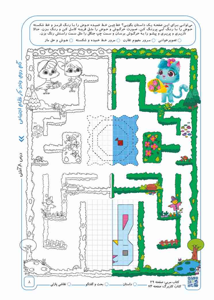 مرور تقارن (درس 5): از کودکان بخواهید تا حوض و صورت خرگوش را مثل نیمه دیگر آن کامل کنند و رنگ بزنند. سپس، ماز را حل کنند و نازپری و پرپری و پیشو را به خرگوش برسانند و در پایان، سمت چپ جنگل را، دقیقاً مثل سمت راست آن رنگ بزنند.
