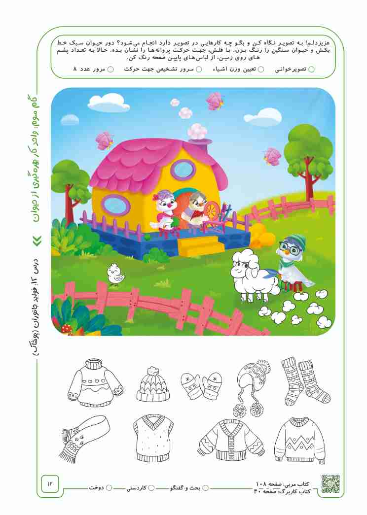 مرور عدد 8 (درس 3): از نوآموزان بخواهید پشمهایی را که در کنار گوسفند (ببعی) افتاده است، بشمارند. سپس به تعداد آن از لباسهای پایین صفحه رنگ کنند.