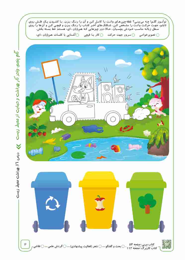 کودکان را به صفحهی آخر کتاب ببرید و از آنها بخواهید تا شکلکهای مربوط به این درس را رنگآمیزی و قیچی کنند. سپس از آنها بخواهید تا تشخیص دهند هر یک از این زبالهها از چه نوع زبالهای است (خشک یا تر). آنگاه هرکدام را بر روی سطل زبالهی مناسب خودش بچسبانند (سطل آبی، زبالهی پلاستیک؛ سطل زرد، زبالهی تر؛ و سطل سبز، کاغذ).
