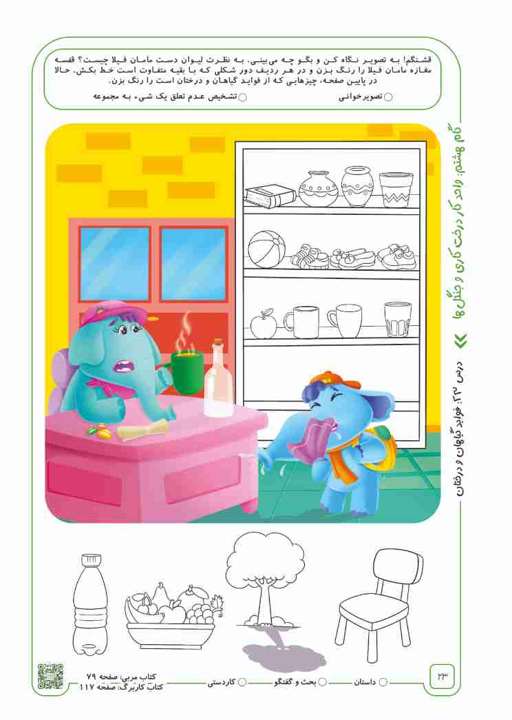 تشخیص عدم تعلق یک شیء به مجموعه (مرور درس 20): از نوآموزان بخواهید تصاویر داخل قفسه مغازه مامان فیلا را رنگ کنند سپس شکلی که در هر ردیف با بقیه فرق دارد را دورش خط بکشند.